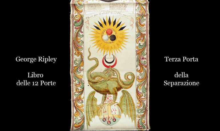 Terza PortaLa Separazione divide una cosa dall’altra, il sottile dallo spesso, lo spesso dal sottile; ma attento ad eliminare il superfluo non con la Separazione manuale, perchè chi opera in questo modo per ottenere la nostra Separazione è un pazzo e non ne trae nessun profitto. Perciò la natura non smette mai di dividere le Qualità elementari, fino al quinto grado, finché non sono tutte trasmutate. [Per quinto grado, Ripley intende la quintessenza]. La Terra diventa un’acqua di colore nero e livido, l’acqua un’Aria molto bianca e l’aria diventa Fuoco, non ci sono qui altri elementi. Da questi elementi e con un’arte deliziosa si fabbrica la nostra Pietra. Di questa Separazione, bisogna meglio parlarne: la Separazione è una quadruplice dispersione dei quattro Elementi . [La trasformazione degli elementi è una delle allegorie concernenti la sequenza del lavoro nella Terza opera. Non abbiamo ancora detto una parola sulle triplici qualità della Pietra: sono le nature metalliche che, mischiate col Mercurio, favoriscono il sopraggiungere del colore nero; successivamente, l’acqua il cui simbolo in questa fase è raffigurato da Saturno, sotto il dominio di Giove si trasforma in Aria. Qui si intendono le nature metalliche in uno stato parziale di rinascita. Quando l’aria si trasforma in Fuoco, vuol dire che lo Zolfo rosso si è unito totalmente con lo Zolfo bianco. Più in alto, nello schema della Pietra abbiamo detto, che bisognava parlare di un Fuoco puro e di una Acqua pietrificata]. Di questa Separazione non trovo nessuna similitudine nel Libro dei Salmi di Davide: Dio ha tratto dalla Pietra un fiume di acqua sorgiva, e da una Pietra molto dura olio in abbondanza. Così farai tu della nostra preziosa Pietra se sei Saggio. Perché non troverai dell’olio incombustibile e dell’acqua, perciò non bisogna soffiare sul carbone. [Il carbone, nell’opera, ricopre lo stesso ruolo della calce, con un’azione riduttrice, assolutamente indispensabile alla trasformazione dei solfati in solfuri o di ossidi in metalli in uno stato di divisione estrema]. Ma se il calore non è sufficiente, bisogna nutrirla prima col Fuoco umido e dopo con quello secco, estraendo con pazienza la flemma e dopo con saggezza le altre nature. Dissecca la Terra carbonizzandola finché abbia sete, diversamente lavorerai invano. Fai in modo allora, che beva la sua umidità. Dovrai fare molto spesso delle separazioni, dividendo la materia in due parti, precisamente il sottile dallo spesso, finché la Terra, di un colore livido, rimane sul fondo del vaso. Questa Terra è talmente fissa, che può sopportare qualunque violenza del fuoco; l’altra parte, è quella alata e spirituale, ma tutte queste cose devono convertirsi in una sola. Allora distillerai l’olio e l’acqua con l’acqua, poi con il suo aiuto riceverai risposta o movimento; ma stai molto attento di non rovinare la tua opera, accertati che il tuo Vaso sia ben chiuso, chiudilo bene col sigillo di Ermes, facendolo sciogliere sulla parte alta e tappandolo ermeticamente. [Questa separazione pone dei problemi perché non sai esattamente in quale momento dell’opera interviene. La q uantità dell’alchimista sopraggiunge all’inizio del lavoro quando egli lavora sullo stibine: la separazione consiste allora, in un piccolo colpo di martello, per separare il régule dall’antimonio dell’ossido di solfuro che aderisce al vaso nel quale è stato cotto lo stibine. Si tratta qui di un esempio di separazione per la via secca. Altri vedono la separazione partendo da sostanze lavorate inizialmente per la via umida nella cornuta. Così è per la preparazione del tartaro vitriolico. La Terra nera che si ottiene come residuo nella cornuta è chiamata “testa di morto dell’acqua forte”. Serve come uno dei principali ingredienti del Mercurio per la via secca. Infine, non viene considerato che la separazione si effettua nel momento in cui le nature metalliche e il Mercurio vengono cotti insieme: la parte alata è costituita allora da una delle nature metalliche che corrisponde all’anima o tintura, che si è sublimata nel Mercurio. Lo Zolfo bianco o toson d’oro sarebbe la parta fissa, non fusibile, ma che arriva tuttavia a sciogliersi nel Mercurio utilizzando una certa proporzione di bi-silicati o di tri-silicati. Allora, si comprende che bisogna fare sciogliere la parte alta del vascello che corrisponde al firmamento del cielo chimico, dove l’anima fluisce, da uno stato disincarnato]. L’acqua con la quale devi ravvivare la Pietra, deve essere distillata spesse volte, prima della tua opera. Potrai conoscere comodamente anche quando sarà purgata delle sue feci immonde e dalle altre sostanze che rigettiamo e che nessuno pensa di moltiplicare con Saturno. Distillala dunque finché sia pulita e sottile come l’Acqua di sorgente in modo che diventi di un colore celeste, chiaro e lucido, in modo da conservare la sua configurazione e la sua pondérosità. Con l’acqua di Ermes umettate il suo albero insieme al suo vaso e fate crescere in alto dei fiori dai diversi colori deliziosi da vedere. [Alexandre Sethon, il primo cosmopolita, così si è espresso chiaramente sulla distillazione filosofica: “Se il grasso dello Zolfo è congelato da questo movimento continuo, lo spirito dell’acqua dopo averlo digerito, passando lo purifica con la virtù dello Sporco, finché non si tinge di un colore digeribile, rosso o bianco; questo colore, che conserva anche la sua perfezione, si alza con questo spirito perché si è stabilizzato con le reiterate distillazioni: lo spirito ha poi il potere di penetrare nelle cose imperfette e così introduce e colora ciò che si unisce dopo a quest’Acqua in parte refrigerata, riempiendo i suoi pori che poi salda con un fissaggio inseparabile. Ogni Acqua se non ha spirito si congela con il calore; se invece si unisce subito allo spirito, si congela col freddo. Ma chiunque sa congelare l’acqua con il caldo ed unire lo 