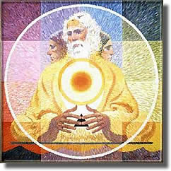 La croceIl braccio vericale della croce è il collegamento tra il nadir (il basso) e lo zenith (l’alto) con cui la mente sottile unisce «cielo e terra», riunendo così l’aspetto fisico dell’uomo (materia-animale), all’aspetto sottile (anima e spirito). Concretamente, il braccio verticale rappresenta il ponte coscienziale che unisce la mente concreta alla coscienza sottile. Per i necessari sviluppi rimandiamo il Lettore all’articolo sulla telepatia verticale che apre il “dialogo” tra le due parti. Il braccio orizzontale della croce è l’orizzonte fisico in cui opera la mente concreta. In quel piano l’iniziato deve imparare ad orientarsi per potersi affermare come coscienza razionale. Solo allora potrà cimentarsi nell’orientamento verticale, che lo porterà a contatto con l’ego superiore ch’è espressione dell’anima. Sette coloriSette colori formano un arcobaleno. L’arcobaleno è stato usato dagli estensori della Bibbia come simbolo del “patto tra cielo e terra” posto da Dio tra se e gli uomini. È il ponte di 7 energie che unisce macrocosmo e microcosmo. Un collegamento che arriva fin dentro l’uomo attraverso sette gangli che gli orientali chiamano «chakra». Le sette energie si manifestano nell’uomo come altrettante sfere di coscienza, e la loro progressiva attivazione porta all’illuminazione. Il bianco è il colore della grande sintesi spirituale che illumina la sfera in cui opera la coscienza fisica. Dal momento che l ‘illuminazione è il Grande Mezzo per liberarsi dai vincoli della natura inferiore, è altrettanto chiaro che tutta l’opera iniziatica si sviluppi all’interno del campo d’azione della coscienza. Per cui l’opera del postulante sarà quella di sviluppare i propri strumenti, accrescendo la portata mentale, potenziando la volontà per ampliare la propria sensibilità. La sensibilità, infine, sviluppa la “seconda vista” dell’iniziato. Tre figureTre figure sono contenute in un aura. L’anziano è «l’antico dei giorni» e rappresenta la saggezza che s’irradia dall’anima. Le figure minori sono il mascolino ed il femminino, che rappresentano i due poli della natura fisica. La doppia polarità è nella natura di ogni uomo e donna. Anche se ripartite diversamente, ogni uomo e donna hanno in sé una parte di mascolino ed una di femminino. Le due componenti fisiche (mascolino-femminino) dapprincipio sono di aspetto emotivo e confliggono tra loro, rendendone instabile la vita mentale. I due diversi, però, diventano stabili quando un elemento maggiore li rende complementari. L’elemento maggiore è «l’antico dei giorni» che ognuno porta in se, nel proprio cielo interiore, riproducendo l’Unità tra sostanza materiale ed essenza sottile, altrimenti simbolizzata dall’arcobaleno. Dove dirigersiIl volto del “saggio” è diretto a destra, perchè in opposizione alla Via Nera. La cosiddetta via della mano sinistra il regno delle illusioni, delle passioni e del pos-sesso (v. I miraggi della Via sensuale). Ogni candidato ad un certo punto si trova ad un bivio, e prende una direzione, che diventa così la scelta di una vita (v. Libertà di scelta e Libero Arbitrio). Continuare a sottomettersi agli impulsi della natura inferiore, oppure intraprendere “la via interiore”. Si conoscono due modi di orientarsi. L’uno sul piano orizzontale della mente e l’altro in verticale. La decisione non è solo quella tra due percorsi, ma scegliere tra due diverse vite e due differenti modi di diventare. Il Grande Mezzo è quello di trasformarsi per “consentire” alla forza spirituale trasmessa dall’anima, di affacciarsi al mondo fisico. Gli “antichi misteri” hanno sempre indicato una sola via, interiore, in contrapposizione ai percorsi esteriori del mondo profano, generatori di conflitti tra fazioni di credo. Il ponte di LuceIl “ponte” che riunisce la sostanza materiale all’essenza è un collegamento fatto di “Luce”, chiaramente rappresentato nell’irraggiamento energetico che scaturisce dal cuore della figura principale. Anche questa simbologia è essenziale, e mostra come sia il risveglio del centro cardiaco ad attivare l’intelligenza dell’anima, che si mostra per mezzo di quella particolare saggezza chiamata “amore intelligente”. Il triangolo oscuroRappresenta il rigore logico con cui l’iniziato agisce sul piano fisico, che lo porta a muoversi con prudenza in ambienti dove le coscienze sono ancora oscure. Lì l’azione dell’adepto deve essere adombrata, perché, certe verità potrebbero risultare troppo intense, e ferire menti ancora in ombra. La forza della verità è dirompente, e menti ancora in ombra quasi mai rispondono positivamente alla sua chiarezza. Molti reagiscono violentemente alla luce, rivoltandosi ai suoi portatori. Per cui “segreti e misteri” esistono per la sicurezza di entrambi. Per chi si fa portatore di “luce”, e per quanti potrebbero usufruirne, ma in forma ridotta, sotto forma di simbolo, metafora o rappresentazione emblematica. Rendere meno “abbagliante” una idea archetipa, fa si che anche i volonterosi che operano con la mente concreta possano distinguerne i significati più visibili, senza che il velo di “sonno interiore” gli si strappi di colpo. |