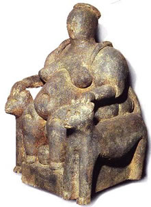 Poiché se è vero che le tribù nomadi del deserto dovevano necessariamente riflettere una struttura sociale di tipo patriarcale, fondata sul culto di un dio unico, antropomorfico e di sesso maschile, la cultura matriarcale di Catal Hϋyϋk è senza dubbio anteriore rispetto allo sviluppo del nomadismo semitico e delle tribù del deserto. L’associazione tra il nomadismo e la cultura patriarcale e monoteistica – così come la corrispettiva rispondenza tra il rigoglio del territorio indoeuropeo con la sua ricchezza e varietà geografica e la diffusione del politeismo – non confuta l’ipotetica diffusione del culto universale di una Dea primordiale (sia che questa si manifesti come Madre Terra o come SdA). Non diversamente dagli altri archetipi femminili, la SdA di Catal Hϋyϋk richiama l’idea della circolarità della vita e della morte. Alla SdA erano associati anche gli avvoltoi, perché la Dea regalava e sopprimeva la vita. Sotto i luoghi di culto della SdA sono stati rinvenuti cadaveri di donne e bambini offerti in pasto agli avvoltoi, forse vittime sacrificali (in genere le vittime di sacrifici religiosi erano scelte tra i prigionieri, piuttosto che tra i membri del clan o tra la popolazione locale: gli aztechi, per esempio, scendevano in guerra principalmente per procurarsi dei prigionieri da sacrificare agli dei). Quest’ultima ipotesi, tuttavia, sembra sconfessata dallo stesso Mellaart, convinto assertore dello spirito pacifico e sedentario che animava le società matriarcali del Vicino Oriente, invase da rozze ed arretrate tribù patriarcali discese dal Nord nel IV millennio a.C. (Cfr. J. Mellart, Earliest Civilizations of the Near East, Londra, 1965). Per Marija Gimbutas, la discesa dei patriarcali e nomadi protoindoeuropei deve essere collocata tra il 4.500 ed il 2.500 a.C. Anche per la studiosa, le tribù nomadi e guerriere colonizzarono e sottomisero le antiche civiltà matriarcali fondate sull’agricoltura e sul culto della Dea. Il risultato dell’acculturazione protoindoeuropea fu il ridimensionamento del prestigio e dell’autorità della Dea, declassata a “semplice” madre, moglie o figlia, di divinità maschili, regali e solari. La stessa civiltà patriarcale sumera potrebbe essere il risultato del processo di acculturazione protoindoeuropeo portato a termine nel 3.500 a.C. Creta minoicaLe difese naturali, peculiari ad ogni territorio insulare, resero Creta molto difficile da conquistare, così il matriarcato ed il culto della SdA resistettero fino al 1450 a.C., periodo che grosso modo segnò l’avvento della civiltà micenea. Dal 2000 al 1450 a.C. – periodi indicati come del Vecchio e del Nuovo Palazzo – si sviluppò una cultura pre-ellenica fondata sull’agricoltura, sull’artigianato e sul commercio marittimo. La mancata traduzione del Lineare A – lingua scritta del periodo minoico – impedisce di avallare ricostruzioni storiografiche ed archeologiche esatte, ma sembra plausibile, dalle oscure fonti in nostro possesso, che il sacerdozio femminile fosse molto importante. Alcuni studiosi – Jacquetta Hawkes, Stylianous Alexiou, Helga Reusch, Ruby Rohrlich – attribuiscono ad una sacerdotessa il possesso del celebre trono del re Minosse. Nella grotta di Dhíkti è stata rinvenuta l’immagine di una SdA o di una Dea dalla testa di serpente affiancata da due grifoni alati: gli stessi animali mitici ritratti sul trono di Minosse. Altri numerosi sigilli sono stati rinvenuti – nelle grotte, nelle abitazioni, nei templi – raffiguranti una Dea che, probabilmente, rivestiva contemporaneamente il ruolo di SdA e di «Madre della montagna»; altre immagini la ritraggono insieme a serpenti e colombe, in prossimità di ulivi. Altre volte, la SdA minoica è raffigurata con corna taurine, le braccia sollevate ed un’ascia a doppio taglio, che Marija GImbutas identifica con una farfalla.