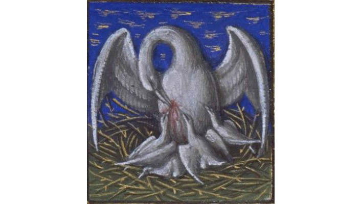 Barthélemy l’Anglais, De proprietatibus rerum (traduction Jean Corbichon), pélican se perçant le flanc pour nourrir ses petits, f. 23v. France, Le Mans, XVe siècle