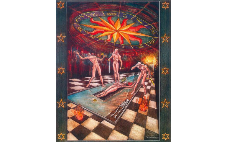 Il Ven.mo scende dal Trono e prende posto davanti all’Ara. Nel frattempo i Maestri Esperti, armati di spada, raggiungono il Compagno d’Arte e, senza dirgli una parola, lo afferrano ciascuno per un braccio, facendolo retrocedere fino alla porta del Tempio, dove il 1° Esperto bussa da Compagno d’Arte.