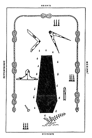 Sul pavimento vi è il Quadro di Loggia in Terzo Grado. In mezzo al Tempio vi è una bara coperta da un drappo mortuario con sopra un ramo di acacia; verso Ovest vi sarà un Compasso e verso Est una Squadra. A Nord, una macchia di sangue sul pavimento e un velo bianco e trasparente macchiato di sangue. Al momento opportuno, prende posto nella bara uno dei Maestri, con i piedi rivolti verso Oriente, ricoperto dal drappo nero, ad eccezione del viso che risulterà invece parzialmente ricoperto dal velo insanguinato.