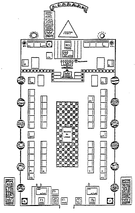 Apprendisti, Compagni, Maestri, 2° Esperto, 1° Esperto, Esperto Terribile, Segretario, Oratore, Due Diaconi, 2° Sorvegliante, 1° Sorvegliante, Maestro Venerabile. Gli Ospiti nei loro gradi e dignità Il M.d.C., ponendo la mano destra sulla sinistra (nell’atto di stringere l’asta), entra con Marcia Rituale (senso orario) seguito dai FF. nell’ordine appena descritto. Esegue la quadratura del quadrilungo girando in senso orario. Terminato il primo giro i FF. cominciano a sedersi nell’ordine seguente: Apprendisti, sulla Colonna nord; Compagni, sulla Colonna sud; Maestri, equamente distribuiti sugli scranni più alti di entrambe le Colonne; 2° Esperto, 1° Esperto, Esperto Terribile, Segretario, Oratore, Due Diaconi. Tutti rimangono in piedi ma non all’ordine. Il M.d.C. esce dal Tempio e rientra seguito dalle Tre Luci nell’ordine: 2° Sorvegliante, 1° Sorvegliante, Maestro Venerabile. Eseguono la quadratura del Tempio, e poi le Luci prendono il loro posto nell’ordine: 2° Sorvegliante, 1° Sorvegliante,Maestro Venerabile. il M.d.C. chiude la porta del Tempio e porge la chiave al Copritore Interno. Chiusura Dei LavoriAlla chiusura dei lavori, fatta eccezione delle tre luci e del Maestro delle Cerimonie, tutti depongono i collari e le insegne delle proprie funzioni di Loggia, ed escono in senso antiorario nello stesso ordine nel quale si è entrati (senza squadrare il quadrilungo): Apprendisti, Compagni, Maestri, 2° Esperto, 1° Esperto, Esperto Terribile, Segretario, Oratore, Due Diaconi, 2° Sorvegliante, 1° Sorvegliante, Maestro Venerabile.