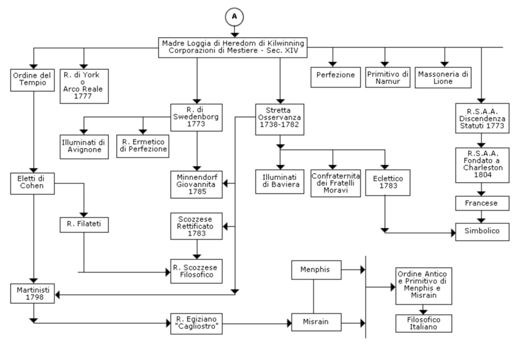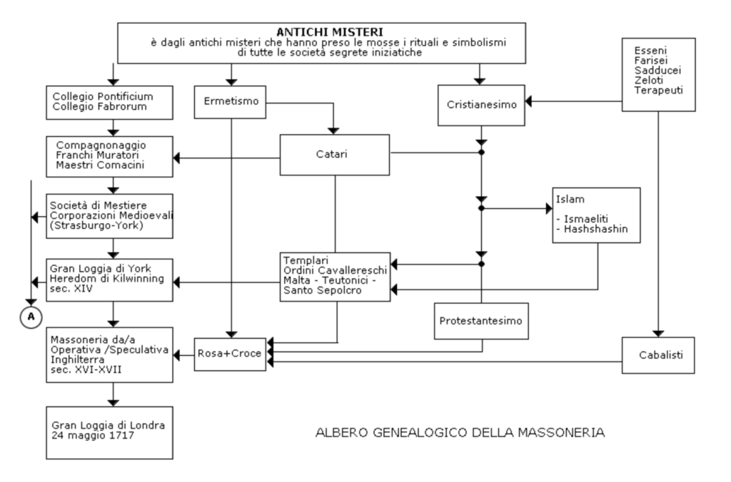 Poiché l’Idea e lo Spirito che animano la Libera Muratoria ci sono pervenuti dalle Corporazioni medievali, le quali costituivano la continuazione di quelle Romane che, a loro volta, sintetizzavano le tradizioni misteriosofiche della Grecia e dell’Egitto, queste antiche tradizioni, evidentemente, hanno avallato – concedendo credito di lievitazione indispensabile ed insurrogabile – le fresche ed impetuose correnti di pensiero e di vita che scaturivano dalle Associazioni segrete di origine Gnostica, Ermetica ed Esoterica. A parte le esagerazioni che sono, del resto, manifestazioni di attaccamento e di amore all’Idea, rimane il fatto che lo Spirito Muratorio presiede a quella legge di evoluzione e di conservazione per cui è stato possibile, ad una modesta minoranza, combattere e vincere tutte le battaglie scatenatele contro dalle forze dell’Ignoranza, del Fanatismo e della Superstizione. In Italia la Libera Muratoria moderna inizia la sua vita in Firenze nel 1733. Indi rapidamente si estende alle città di Milano, Verona, Padova, Venezia, Roma e di Napoli ove assume contegno più fiero ed importanza eccezionale. Nello scorcio di soli cinque anni – dal 1775 al 1780 – altre 300 Logge sono all’opera un po’ dovunque nel nostro Paese. E, tra le mille traversie in cui è costretta a passare, s’inserisce, naturalmente diremo, nel quadro delle rivendicazioni risorgimentali con i suoi uomini più importanti come Cavour, Mazzini, Garibaldi, D’Azeglio, Carducci, Crispi, Cavallotti, ecc. Albero Genealogico della MassoneriaSulla Morale MassonicaIl neofita deve iniziare con pazienza la costruzione, mattone sopra mattone, del Tempio della Verità, ed erra se entrato nella Famiglia alla ricerca di favori immediati ed immeritati. Noi lavoriamo per il bene dell’Umanità senza aspirare a privilegi e ricompense. Il non avere pazienza, o peggio, presumere di poter bruciare le tappe senza avere una maturata preparazione rituale ed esoterica è condannevole illusione, e come tale, porterebbe ad amari risultati finali. È bene dire, per esempio, che è in grave errore colui che trovandosi in stato di privilegio nella vita profana, ritenga di essere un po’ più in alto, più distaccato dai propri Fratelli meno di lui affermati nelle varie attività della vita profana. Se un tale Fratello esistesse farebbe bene a soffermarsi più spesso a meditare sui concetti di eguaglianza e fratellanza (dovrebbe cercare di eliminare, da solo, quell’attaccamento a forme di vita contrarie alla nostra Istituzione, che lo tengono spiritualmente lontano dalla Comunione Massonica). Queste piccole citazioni di atteggiamenti sia pure comuni nella vita profana così in contrasto con i nostri principi, fanno ben comprendere come tutti i metalli debbano esser lasciati fuori dai nostri Templi. Man mano che il neofita procederà nel perfezionamento della propria vita con l’ausilio insostituibile dei principi massonici si libererà certamente di quanto con questi contrasta. Al fine di chiarire la morale massonica è opportuno riportare integralmente gli “antichi” precetti massonici che hanno una loro funzione educatrice basilare sul carattere e sulla formazione morale degli adepti. Essi sono:
