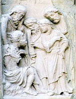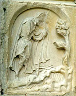 Fig 1 e 2 Le due immagini che abbiamo descritto dovrebbero riassumere il percorso tracciato dalle prime sei coppie di bassorilievi; la prima, “La derisione di Giobbe” ci parla del destino a cui va incontro chi si consacra all’Opera: non essere riconosciuto, subire la riprovazione e il rigetto della comunità di cui fa parte, intraprendere un cammino solitario. La seconda allude invece alla sorgente misteriosa che l’alchimista deve trovare per intraprendere il lavoro alchemico. Esamineremo le prime sei coppie di bassorilievi, parlando dei segni zodiacali che vanno dall’Ariete alla Vergine, seguendo un percorso che comincia dalla parte sinistra guardando la cattedrale, procedendo dall’esterno verso l’interno. Ogni volta che assoceremo ad un segno zodiacale una coppia di bassorilevi, interpreteremo il bassorilievo superiore come una indicazione dello strumento da utilizzare nell’Opera in quel segno zodiacale, quello inferiore come una indicazione dell’operazione che va compiuta. La prima coppia mostra nella parte superiore una donna che reca un emblema con una colomba [5], nella parte inferiore un cavallo che tenta di disarcionare il suo cavaliere (cfr. fig. 3 e 4) [6].
